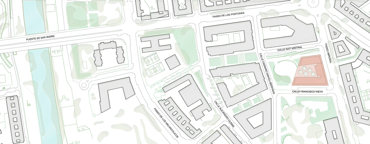 Este edificio de vivienda pública en Arganzuela se sitúa en un solar complejo del distrito de Arganzuela, con una pendiente muy marcada. El terreno presenta un desnivel de más de nueve metros, que condiciona la volumetría y el reparto de usos. El edificio se organiza en forma de U abierta a la calle. Así se mejoran los accesos, la entrada de luz natural y las vistas hacia el patio. La planta baja, en la cota 699 m, actúa como nivel principal de llegada. Desde aquí se accede tanto a las viviendas como a los locales comerciales.