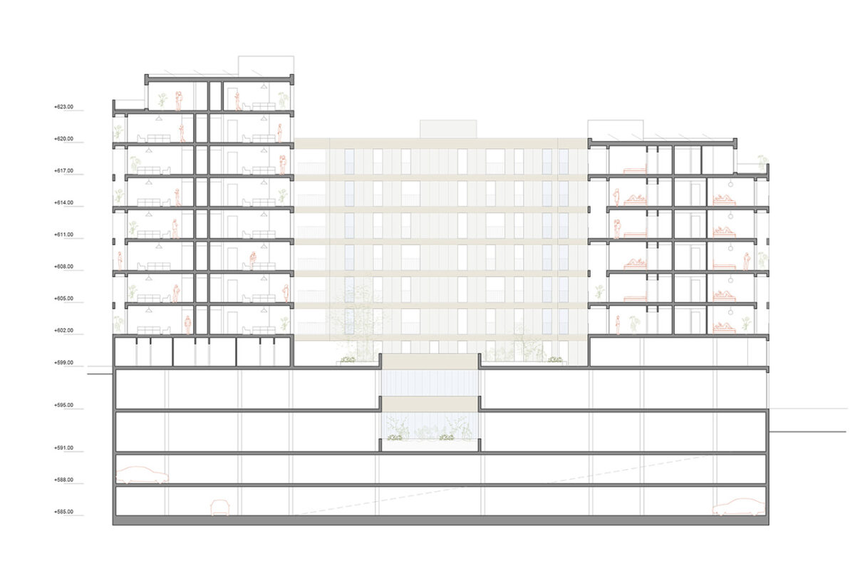 Sobre este basamento se disponen 167 viviendas. La ordenación busca agotar la edificabilidad permitida sin perder calidad espacial. Todas las unidades se orientan a una fachada exterior. Miran a la calle o al patio abierto, y garantizan luz, ventilación cruzada y privacidad. Este criterio mejora la relación entre superficie útil y construida. También refuerza la vida comunitaria en el interior de la manzana. Por debajo del nivel de acceso se alojan dos plantas de equipamientos públicos. Estos espacios se conectan directamente con la calle Francisco Nieva. Las dos plantas inferiores se destinan a aparcamiento y áreas técnicas. Una rampa continua asegura una circulación clara y eficiente. En conjunto, el edificio de vivienda pública en Arganzuela combina eficiencia estructural, claridad funcional y una adaptación precisa a la topografía. El resultado es una solución urbana equilibrada que aporta densidad, confort y un patio luminoso al barrio.