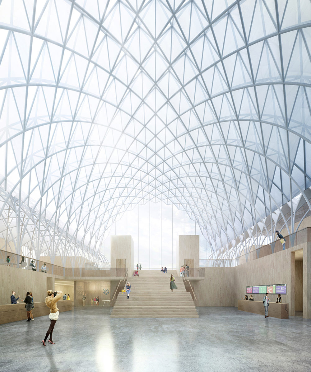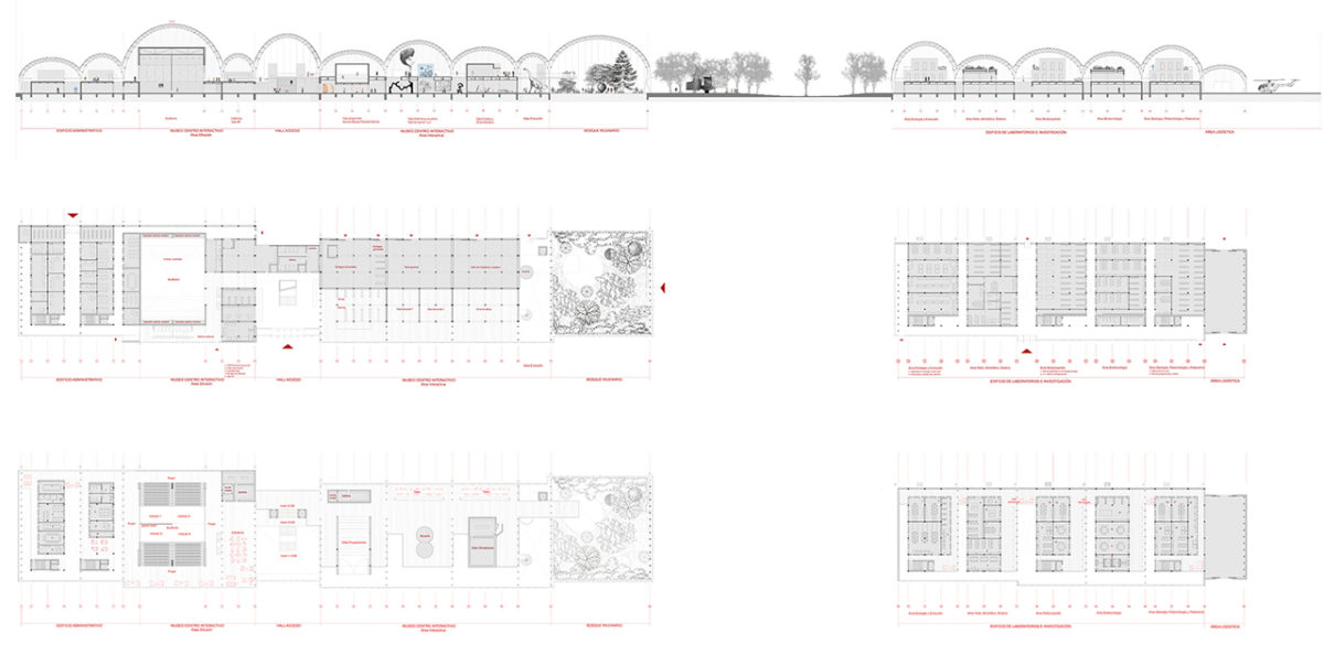 The proposal’s spatial organization is ruled by a dual system. On one hand, at the bottom, a group of boxes conform a socle distributed in three levels. This socle is built in concrete structure and movable timber partitions that hosts the uses with the most restrictive climatic and lighting conditions. These boxes are covered by the set of metal-structured vaults enclosed by translucent glass paneling that perform as passive temperature regulators. The proposal therefore understands the vaults as a set of structurally and climatically efficient elements. At the same time, they also offer an iconic image for the new International Antarctic Center.